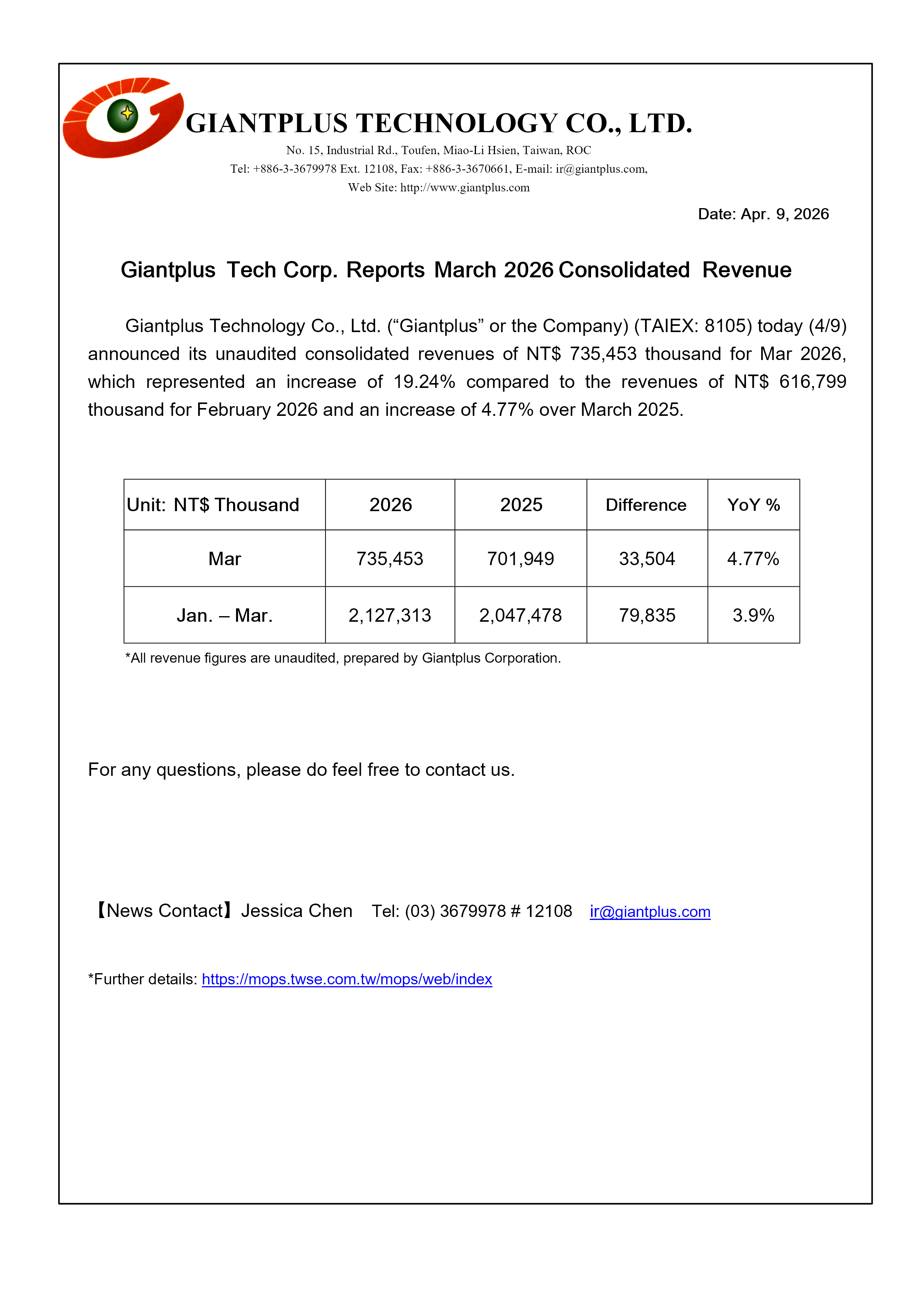2026/04/09 Finance Giantplus Tech Corp. Reports March 2026 Consolidated Revenue Giantplus Tech Corp. Reports Mar 2026 Consolidated Revenue.pdf