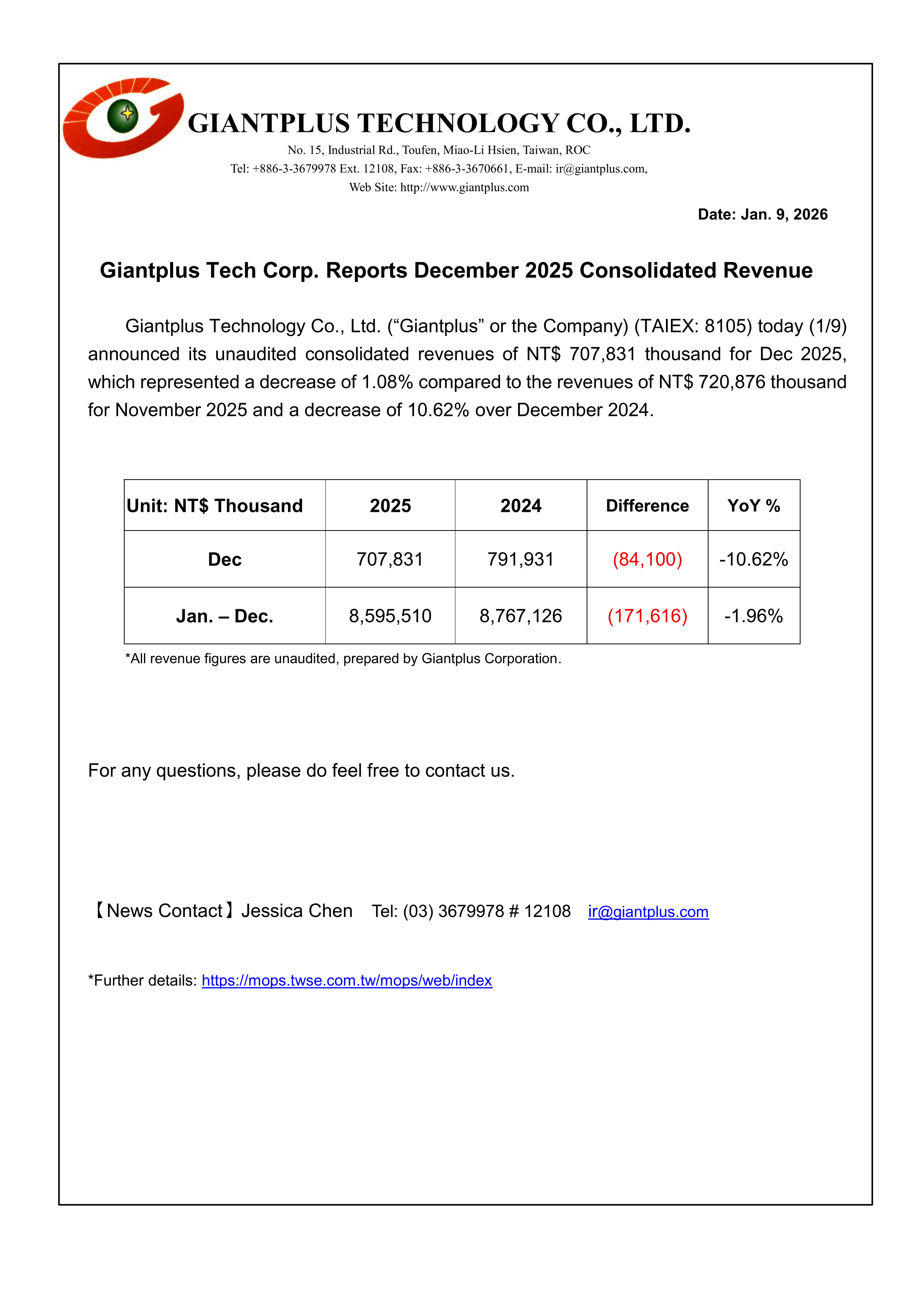 Giantplus Tech Corp. Reports December 2025 Consolidated Revenue