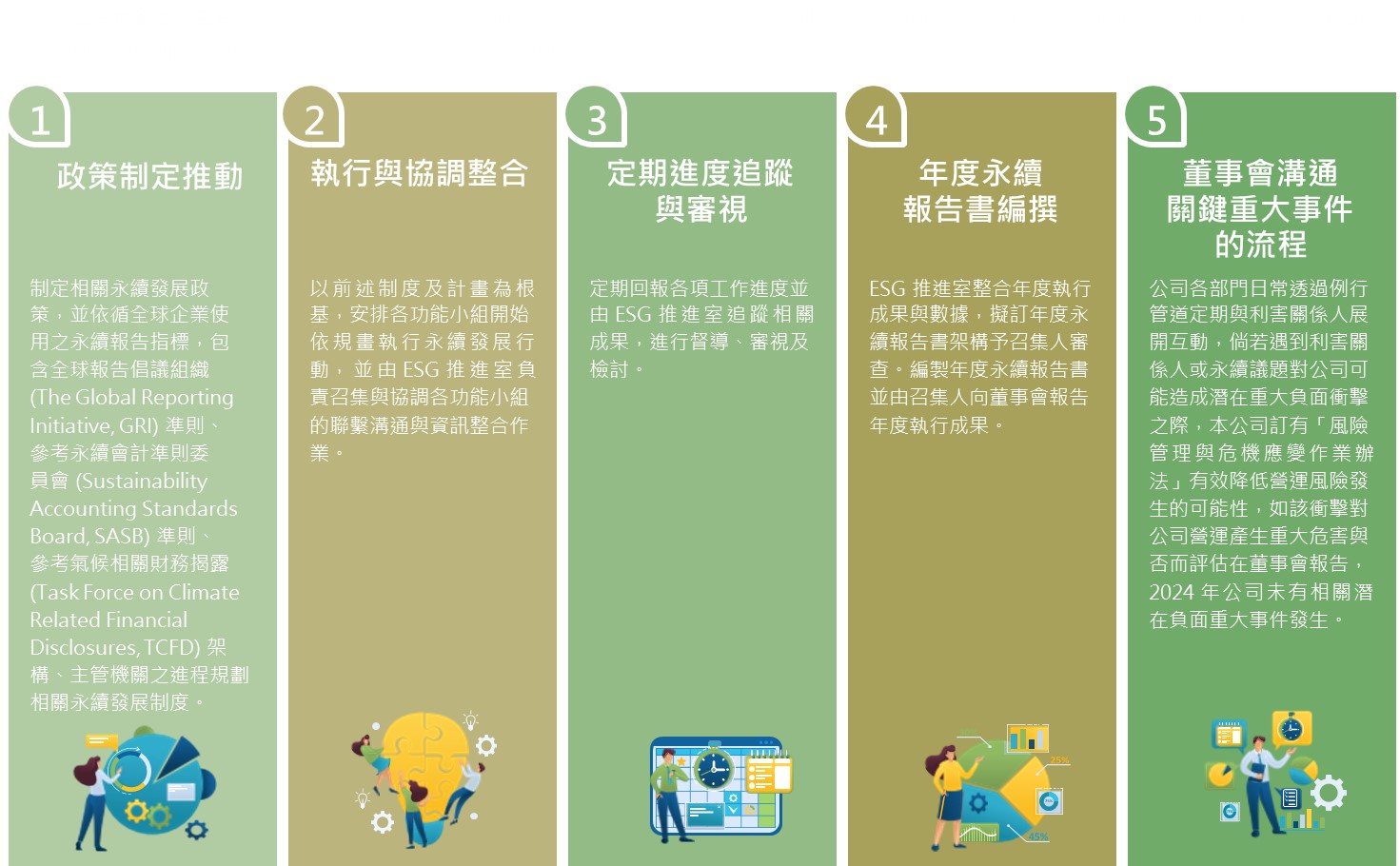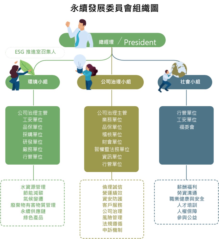 永續發展委員會下設置永續發展推進室,協助本委員會推行各項計畫,由總經理授權成立,並指派ESG推進室許協理擔任 ESG 召集人,永續發展推進室之下設立各功能小組,「公司治理小組」、「環境小組」及「社會小組」,由各營運單位主管指派代表組成,依各營運單位權責歸屬於各小組,為本公司永續發展議題管理之執行單位,彙整重要利害關係人對於本公司各項永續發展議題的關注與期望,並向本委員會呈報永續發展之執行情形。