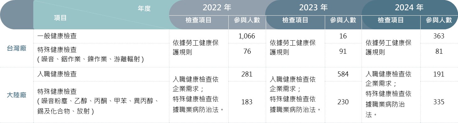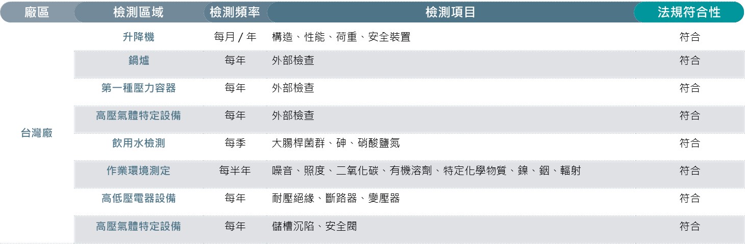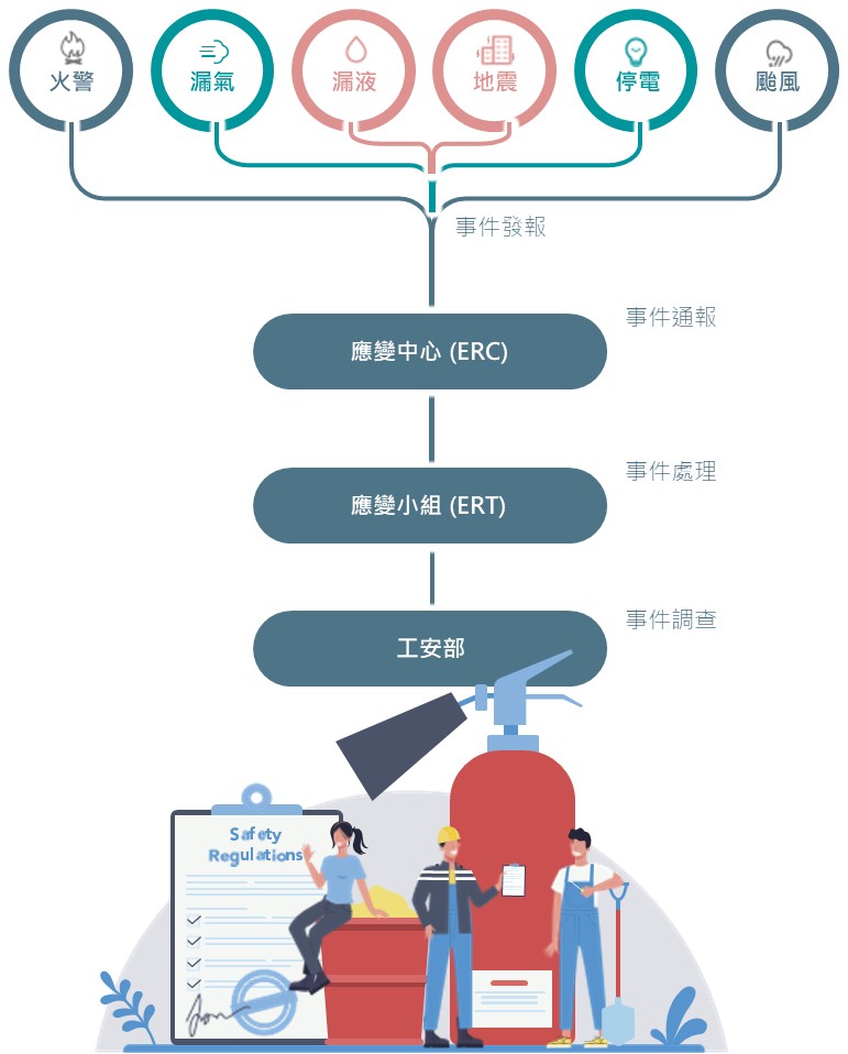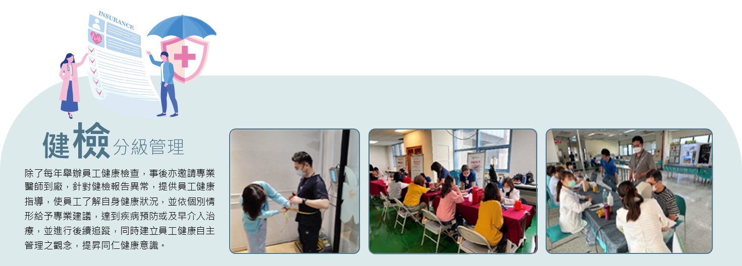 標準以降低員工作業的風險,以及提供必要之保護措施或個人防護配備、實施作業環境測定、緊急應變與逃生演練、定期健康檢查並分級主動關懷,若發生災害及時提供醫療照護、職業災害管理與內部安全衛生巡檢,防範廠內災害及減少風險產生,持續改善安衛工作。