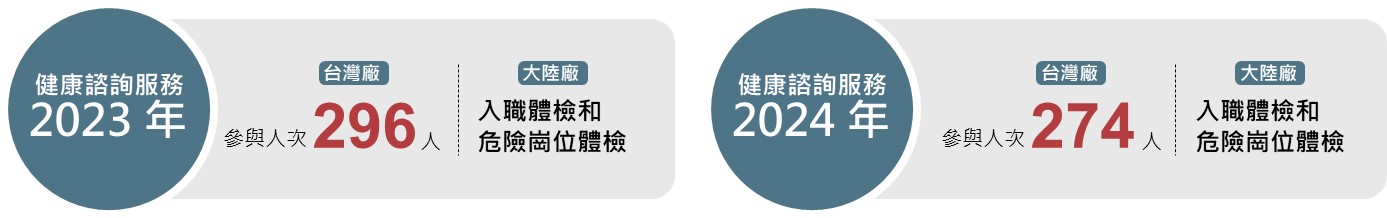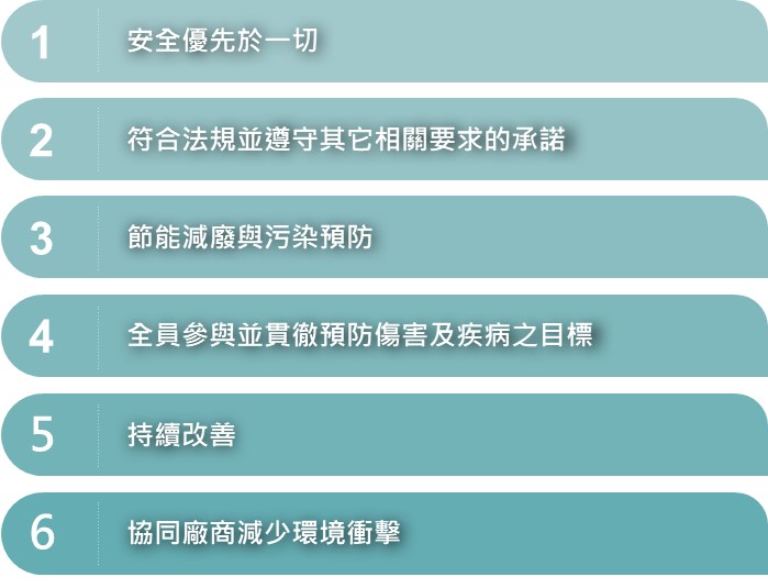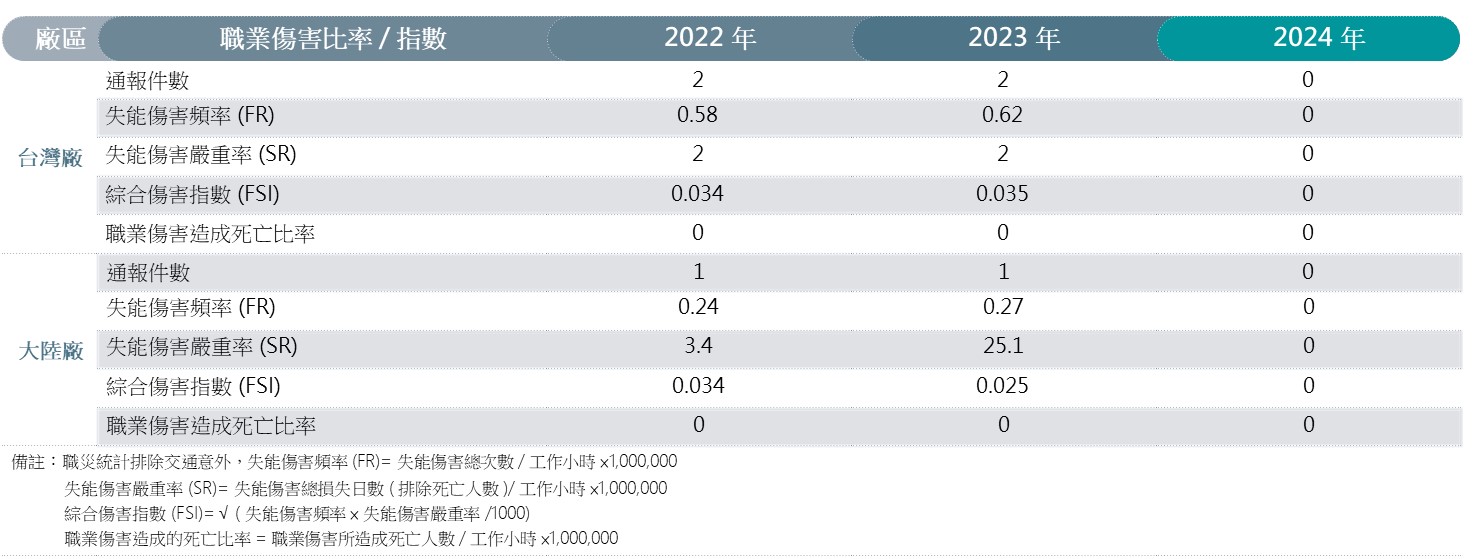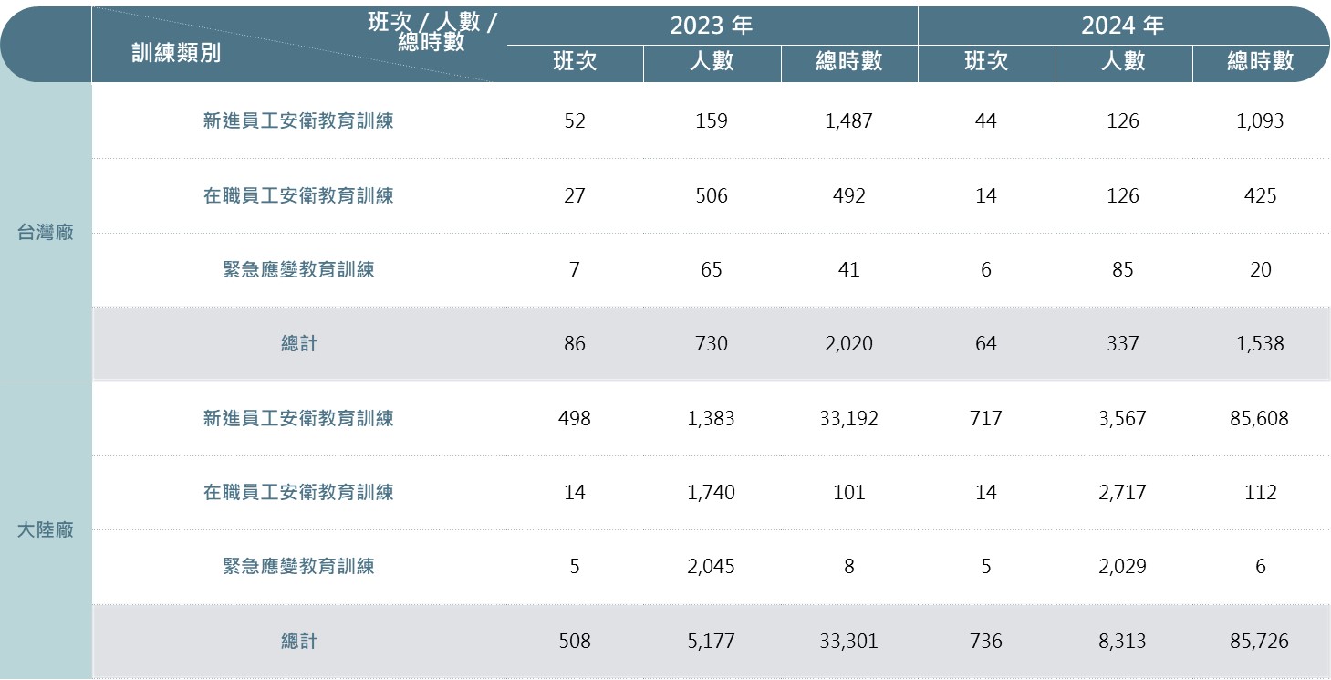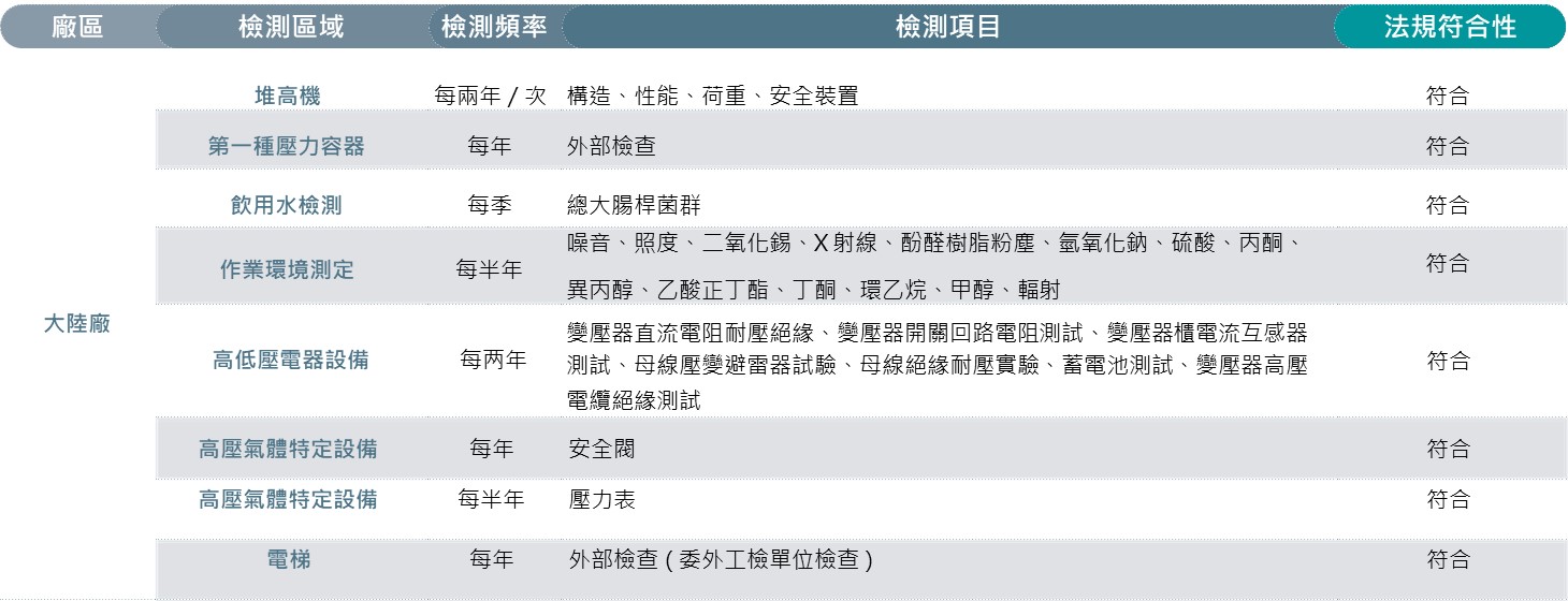 標準以降低員工作業的風險,以及提供必要之保護措施或個人防護配備、實施作業環境測定、緊急應變與逃生演練、定期健康檢查並分級主動關懷,若發生災害及時提供醫療照護、職業災害管理與內部安全衛生巡檢,防範廠內災害及減少風險產生,持續改善安衛工作。