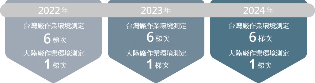 針對工作環境的管理,制定「作業環境監測管理程序」,掌握勞工作業環境實態與評估其物理及化學因子暴露狀況,採取規劃、採樣、監測及分析之方式,每年依法進行四次作業環境測定,以提供安全且舒適之工作環境。