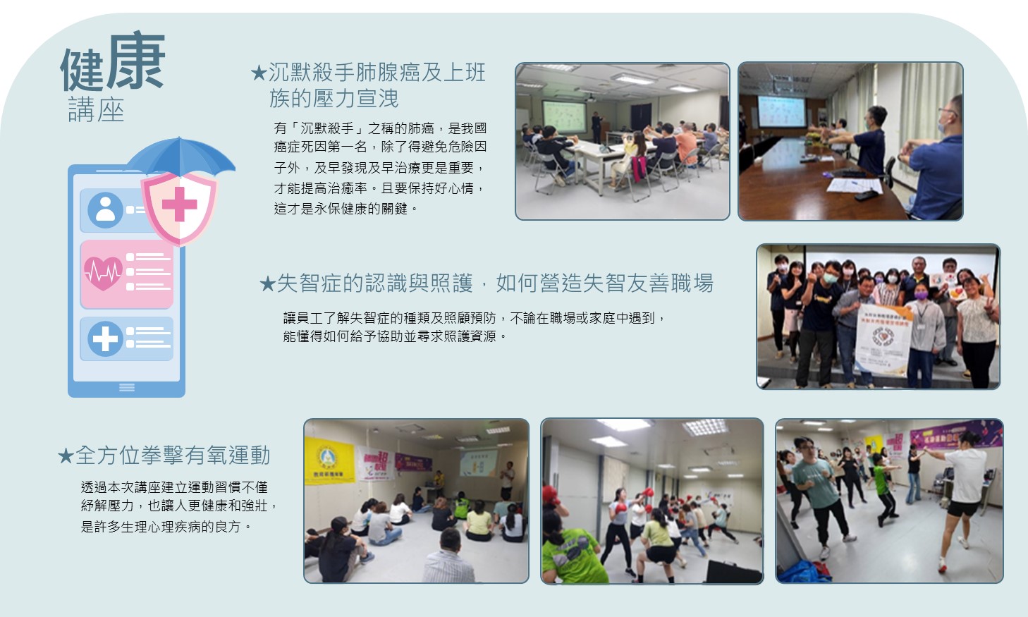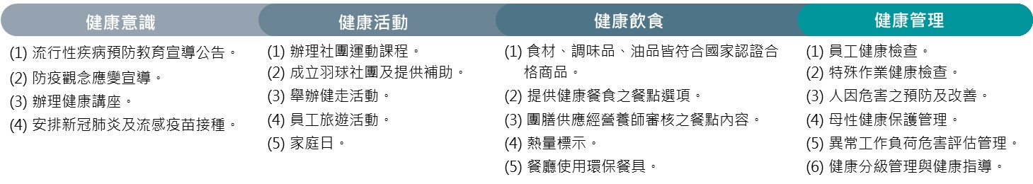 公司積極推廣職場健康,除了達到勞動安全及健康照顧等相關法規要求外,於健康意識、健康活動、健康飲食及健康管理等健康措施構面,投入心力和