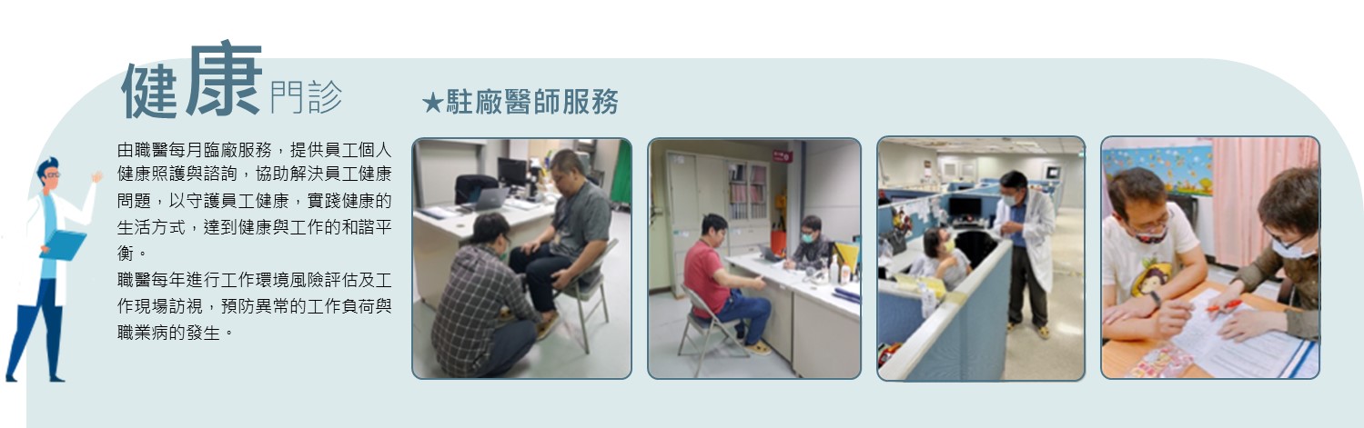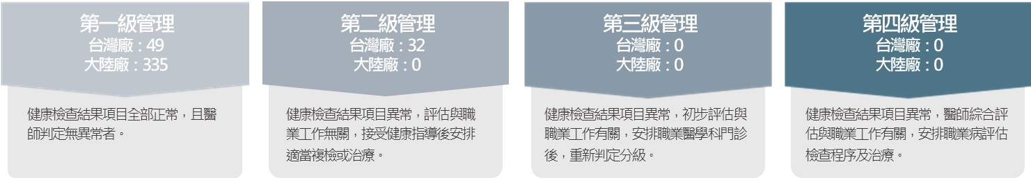 有危害及無危害等四個等級。針對「有危害」的員工個案,工安部將評估其危害風險並辨識危害因子,並安排職業醫學科醫師進行診斷。醫護室則負責定期追蹤確診肌肉骨骼傷病勞工病情、復原情形與工作適應問題。