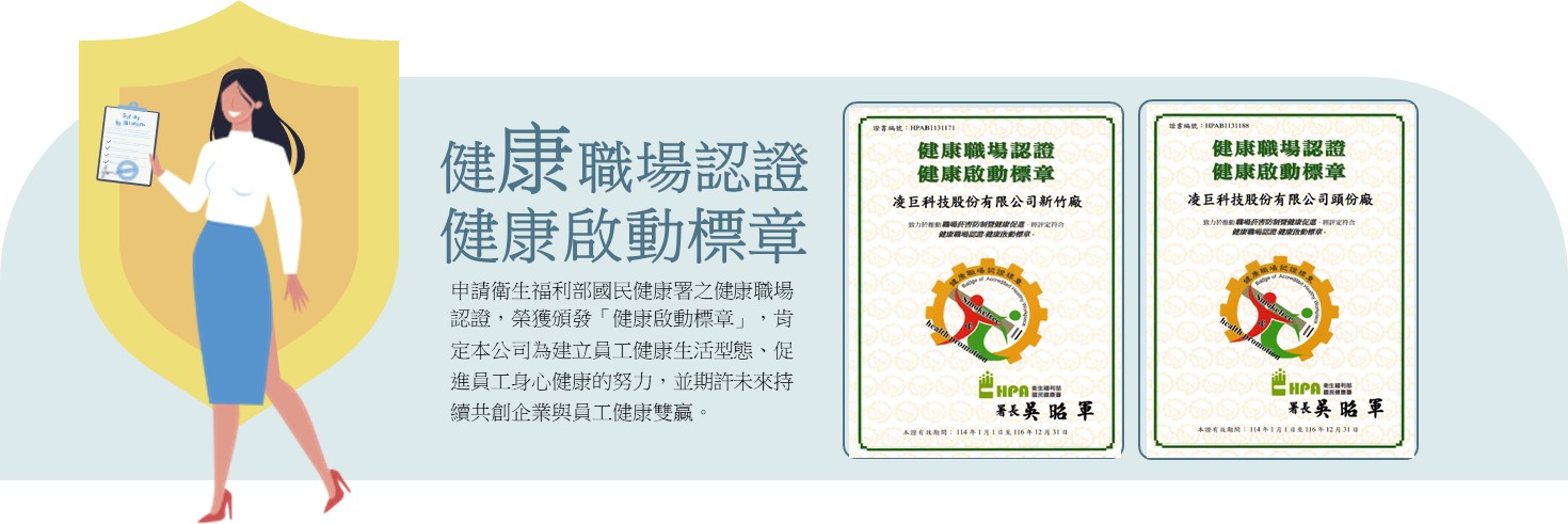 凌巨科技依衛生福利部國民健康署健康職場自主認證規定申請。台灣新竹廠及頭份廠於2024年12月取得2024年健康啟動標章。希望藉由健康職場自主認證的機制,提升推動無菸環境、開始推動職業傷病預防與職場健康促進工作。凌巨科技將持續推動無菸環境、職業傷病預防及健康促進計畫,讓公司職場邁向更健康、更完善。