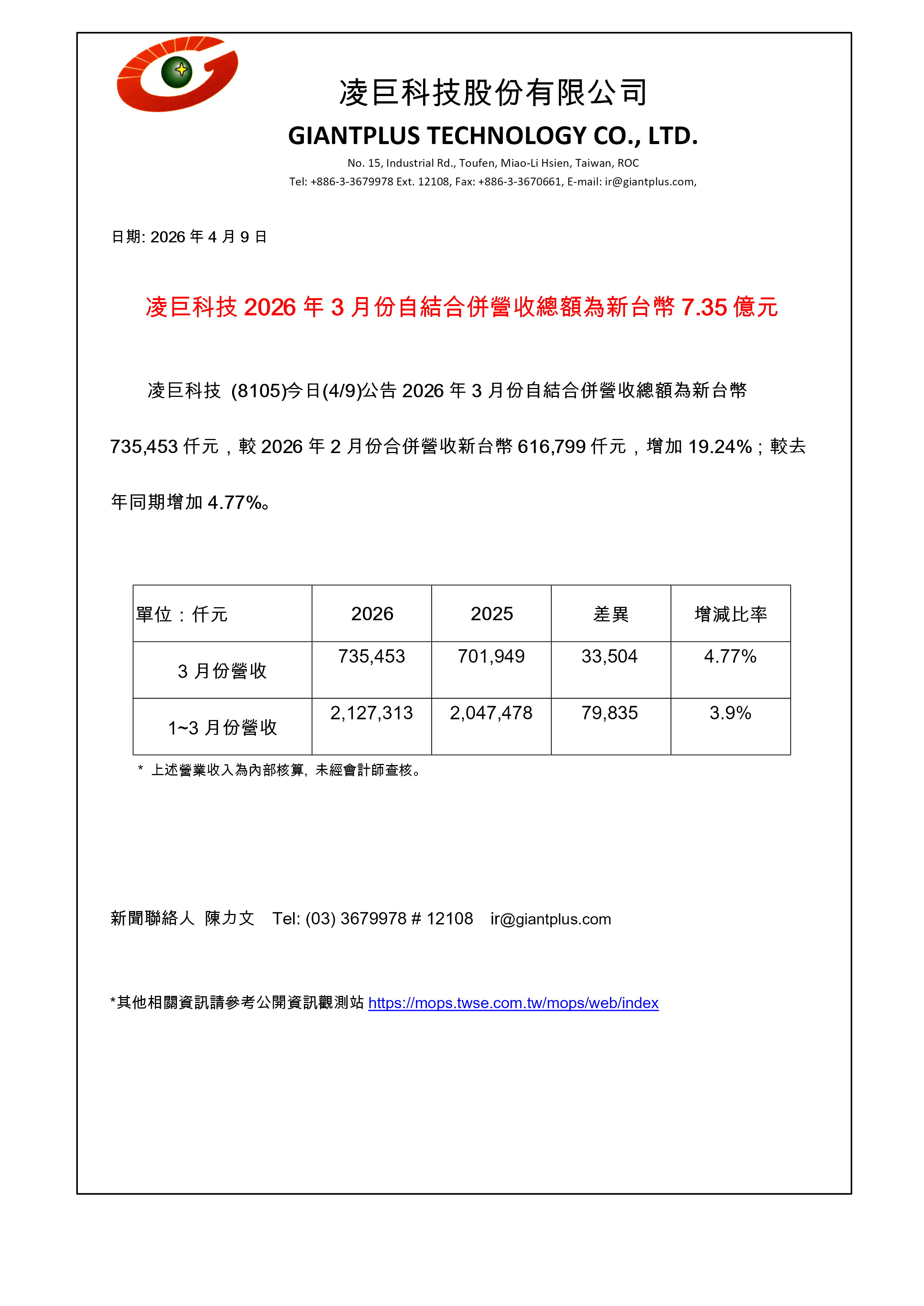 凌巨科技2026年3月份合併營收為新台幣7.35億.pdf